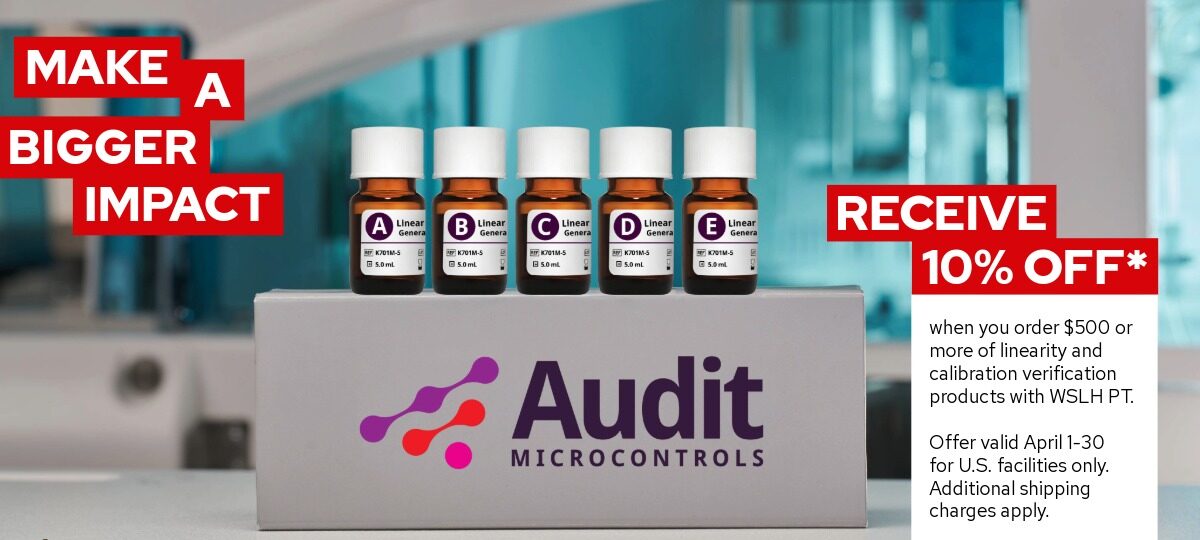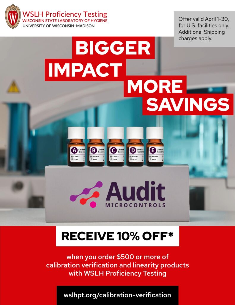 Receive 10% off when you order $500 or more of AUDIT calibration verification and linearity products with WSLH Proficiency Testing.*